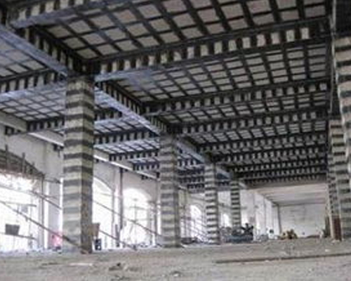 干式外包钢法 ,综合耐温好、加固件加固后承载力大幅度提高、整体性强、可靠性高、工艺简便,工期短、对周围生产环境影响小。